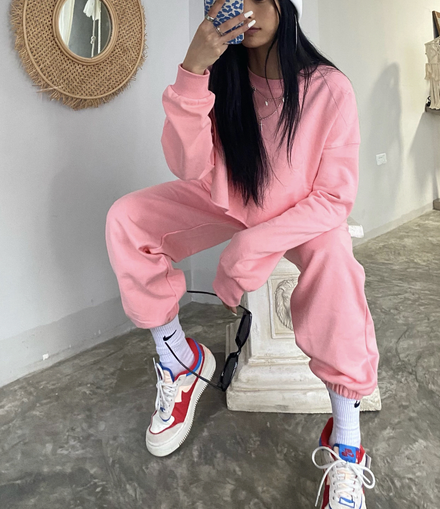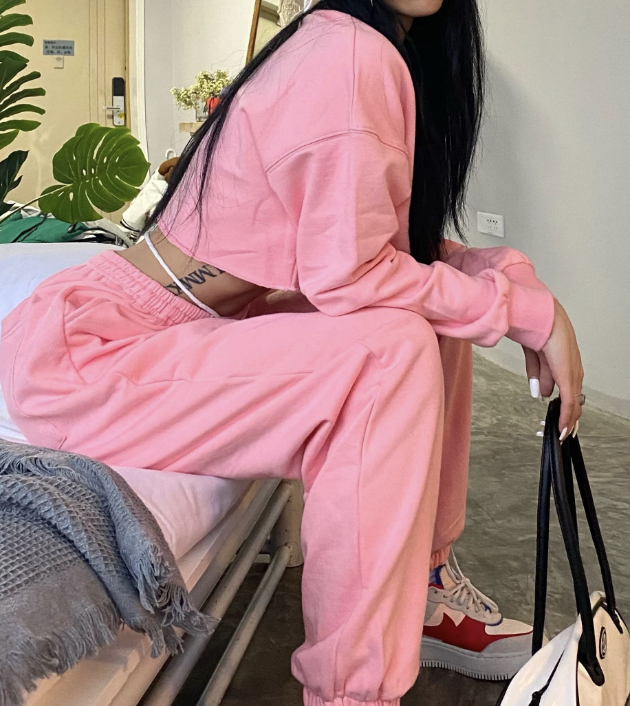 Two Piece Cotton Crop Top Jogger Set - PINK